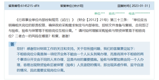 《行政事业单位内部控制规范(试行)》(财会【2012】21号)第三十三条:“单位应当明确相关岗位的职责权限,确保政府采购需求制定与内部审批、招标文件准备与复核、合同签订与验收、验收与保管等不相容岗位互相分离。”请问如何理解采购验收与物资保管是不相容岗位?二者合一的风险在哪里?盼复,谢谢!